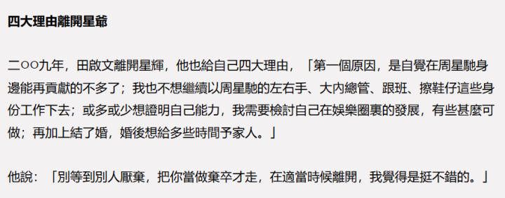 田启文透露离开周星驰的四个原因包括,第一,觉得在周星驰身边的贡献不多了;第二、不想当周星驰的左右手、大内总管、跟班、擦鞋仔;第三、想证明自己的能力,看看娱乐圈还有什么可以做的;第四、结婚了想多一些时间陪伴家人。