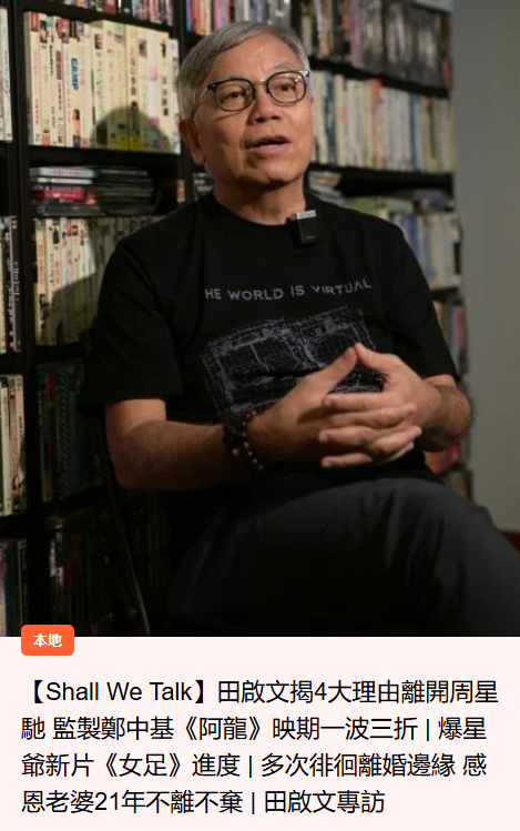 64岁的田启文在《少林足球》出演“三师兄”为大众熟知,他也是为数不多,没有和星爷反目的周星驰御用配角,田启文在9月22日接受港媒采访,爆料当初离开周星驰的四大原因,两人没有吵架,而是和和气气的解除合作关系。