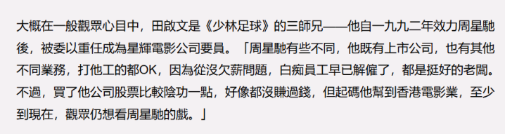 即便如此,他认为周星驰为香港电影业贡献了很多,时至今日,大家还是会去电影院支持星爷。