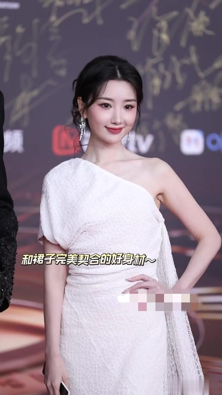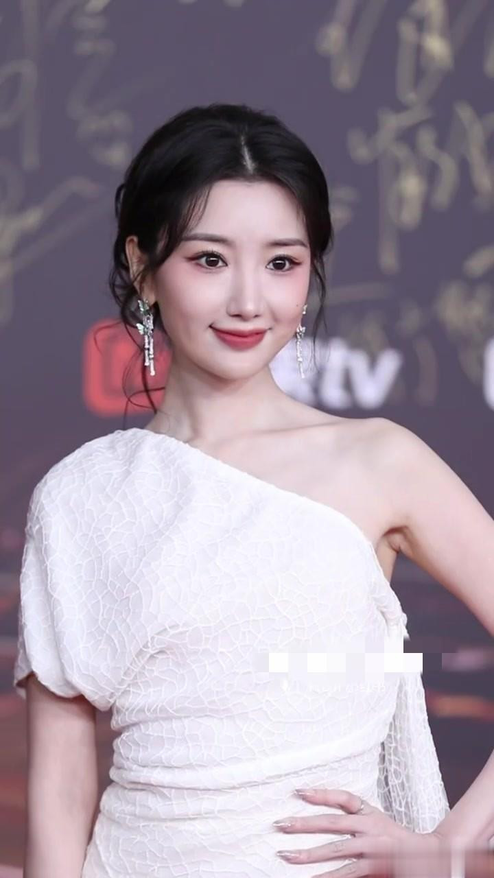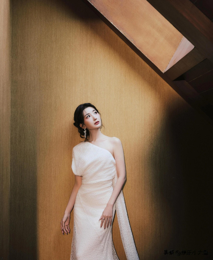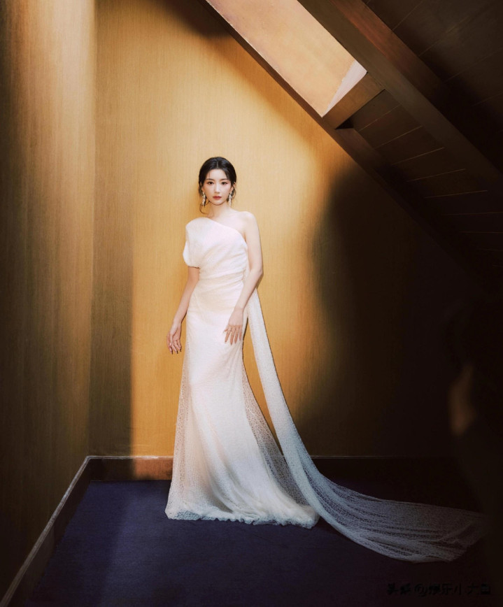 毛晓彤出席微博视界大会, 白色露肩礼服裙发髻低挽, 腰肢纤细好美