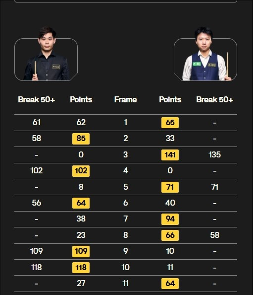 全场比赛,江俊打出一杆135分和两杆50+(71、58),贺国强打出三杆破百(102、109、118)和三杆50+(61、58、56)