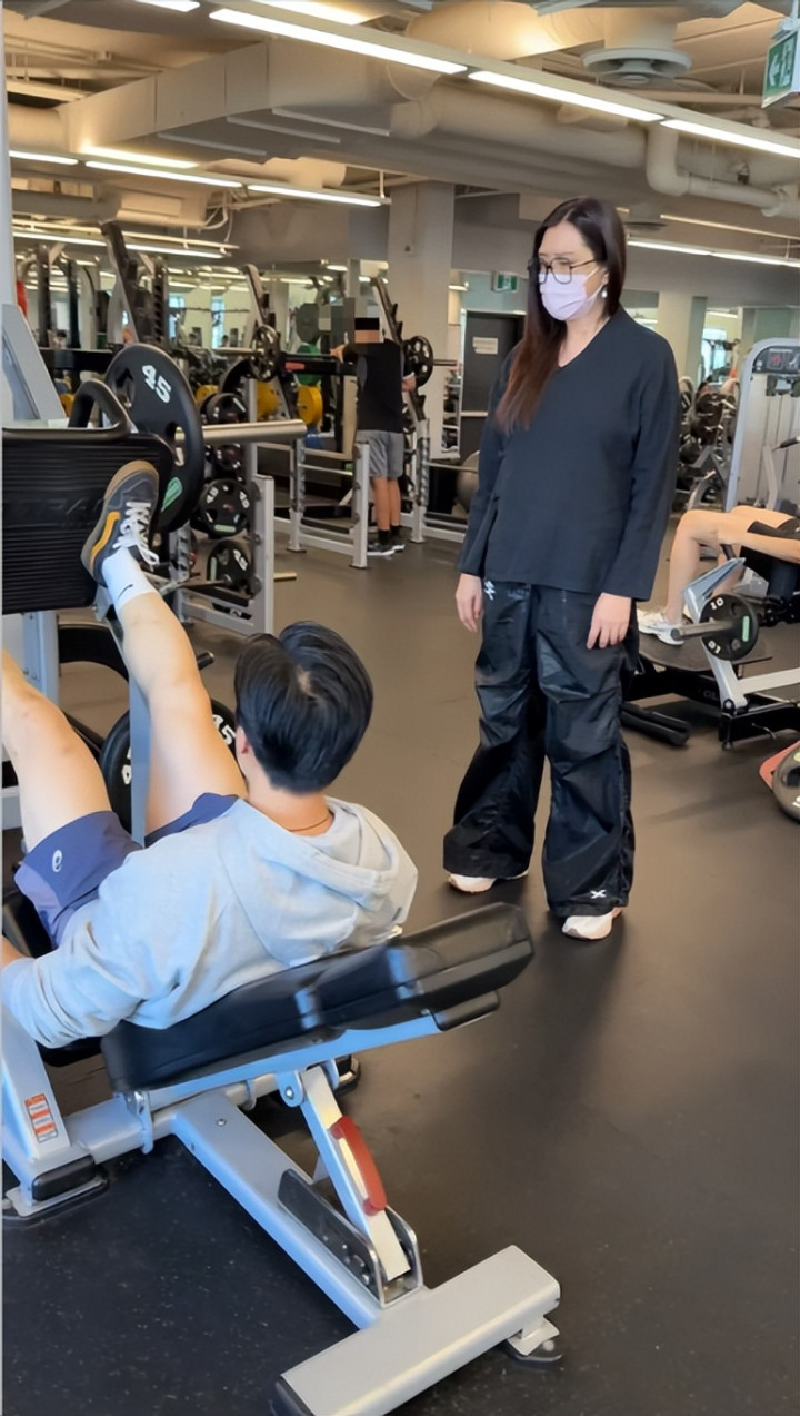 随后王祖贤找到私人教练健身,教练坐在器械上示范,她则像学生一样站着乖乖听讲。