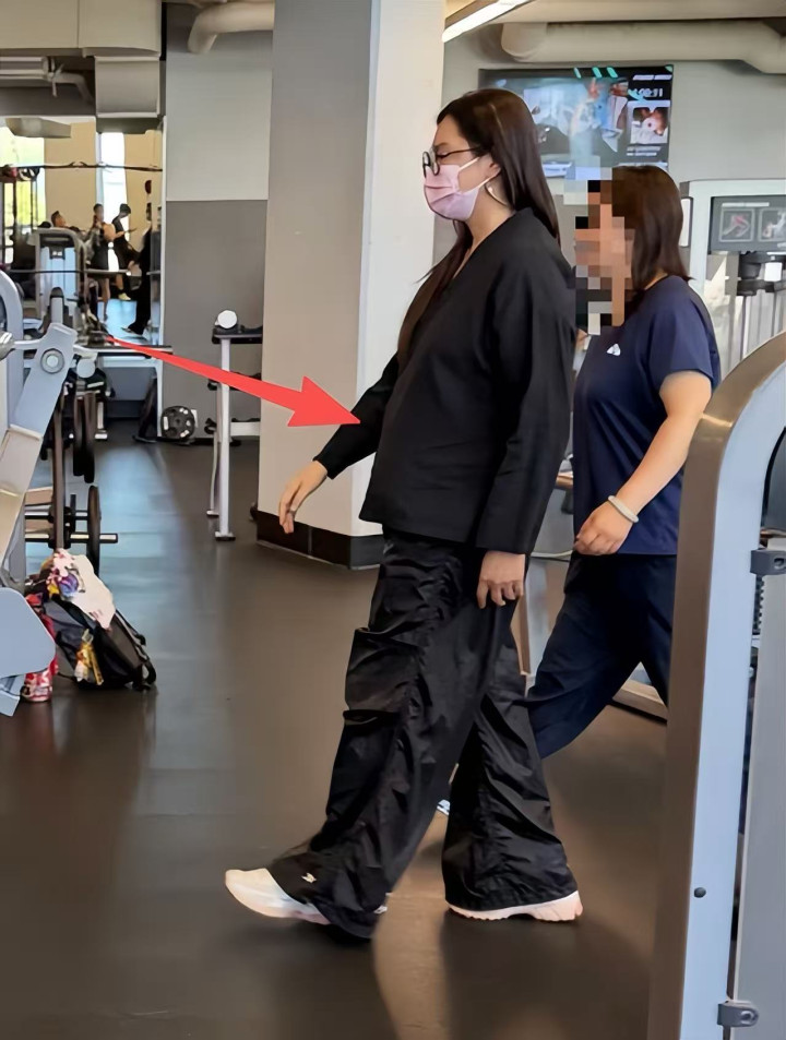 健身房的工作人员带着王祖贤闲逛,从侧面看她的肚子真不是一般大,将特别宽松的衣服都撑起来,这肚大如箩的确实该减肥了。