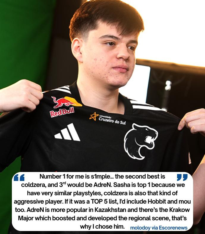 是的。TOP1选萨尼亚(s1mple的昵称),是因为我们的游戏风格非常相似。coldzera也是那种进攻型的选手。至于AdreN……要是选TOP5的话,我还会加上Hobbit和mou。AdreN在哈萨克斯坦大概更受欢迎、更知名一些,他有冠军荣誉在身,还提升了哈萨克斯坦(CS领域)的地位,所以选他。