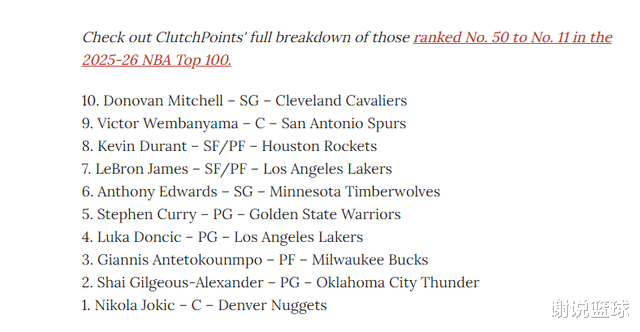 所以美媒在新赛季开始前,评选现役百大球星时,给足了老前辈面子。这份榜单约基奇领跑没任何悬念,之后是亚历山大、字母哥和东契奇,同样算各家媒体之间共识。相反库里排名第五,詹姆斯和杜兰特同样挤进前十,美媒也真是给足老前辈面子。