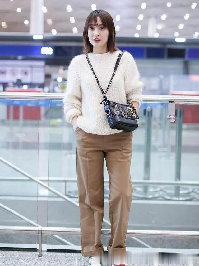 吴昕机场私服越来越简约! 穿米白毛衣+直筒裤, 时髦又减龄!